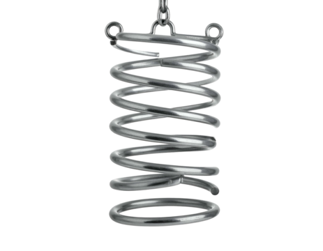 Gleaming metal coil suspension, hanging from a chain