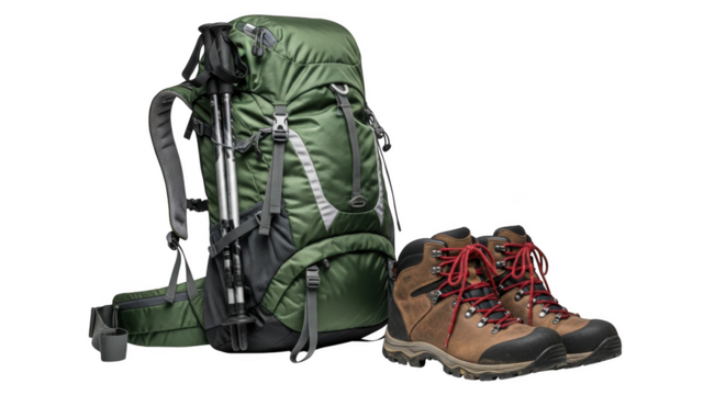 Green backpack with hiking poles and brown boots trekking