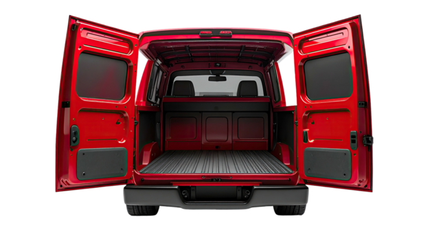 Open-door view of a red cargo van interior, revealing a spacious cargo area, and rear seats