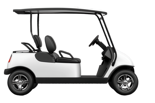 Stylish white golf cart parked with a sleek design, perfect for leisure activities on golf courses or resort grounds during sunny days