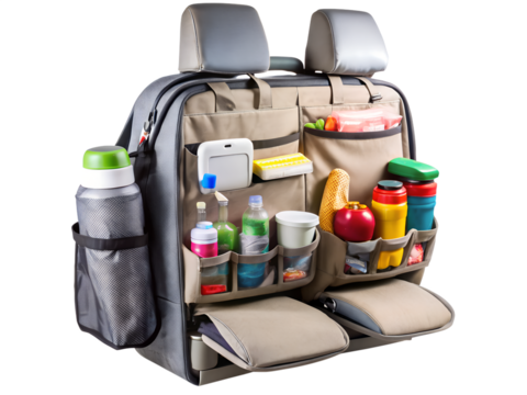 Car back seat organizer filled with various items like bottles, food, and accessories isolated on transparent background