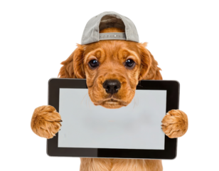 Brown cocker spaniel puppy wearing a backward baseball cap, holding a tablet with its paws and gazing directly forward.