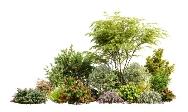 Beautiful garden plants, flower and trees isolated on transparent background. 3D render.