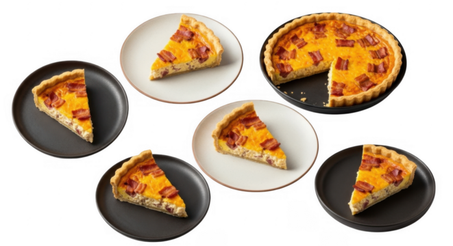 Delicious Quiche Slices on Various Plates with Bacon and Cheese Topping, isolated on a transparent background