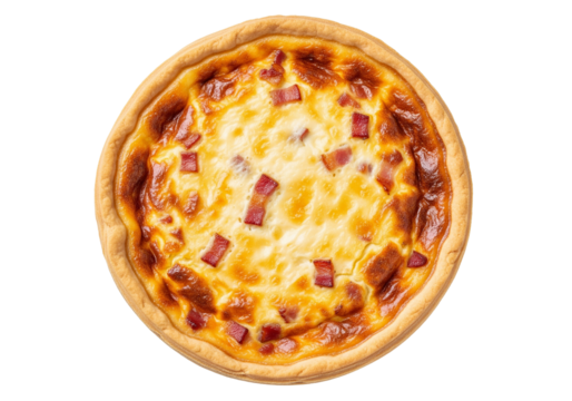 Savory quiche Lorraine with a golden crust, filled with melted cheese and bacon pieces.