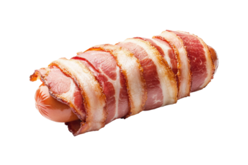 Crispy bacon-wrapped sausage on black background, cut out