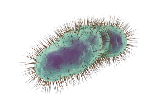 Detailed 3D illustration of a microbial cell, likely a bacterium, showcasing its elongated form and external hair-like structures. background removed