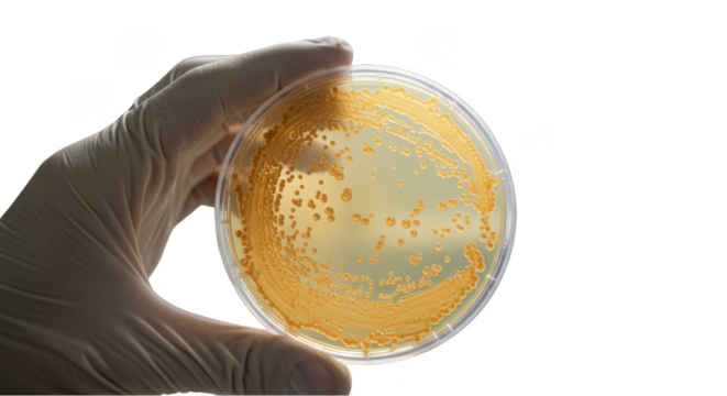 Gloved Hand Holding Petri Dish With Bacterial Colonies Transparent Background Photo