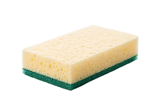 Yellow sponge with green scouring pad for cleaning dishes, isolated on a transparent background