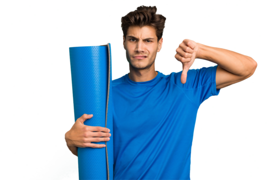 Young caucasian man holding an electric toothbrush isolated cut out showing a dislike gesture, thumbs down. Disagreement concept.