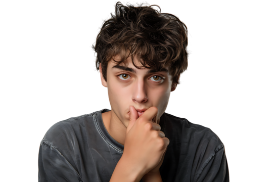 Close up portrait of young man holding his nose as if smelling something on isolated transparent background