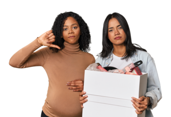 Latin women couple moving, one pregnant  showing a dislike gesture, thumbs down. Disagreement concept.