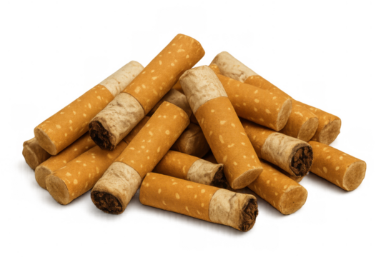 Pile of discarded cigarette butts representing smoking cessation, addiction, health problems, and tobacco waste on transparent background