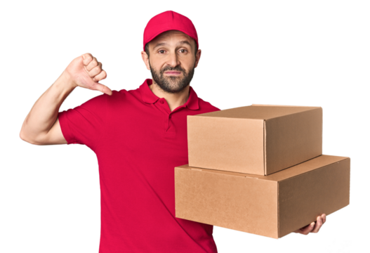 Hispanic male courier with boxes showing a dislike gesture, thumbs down. Disagreement concept.