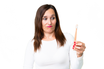 Middle age woman brushing teeth over isolated chroma key background with sad expression