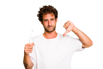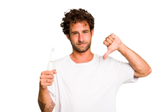 Young caucasian man holding an electric toothbrush isolated showing a dislike gesture, thumbs down. Disagreement concept.