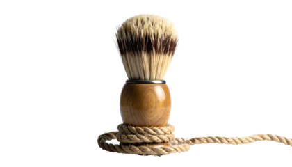 A classic shaving brush sits atop coiled rope, set against a black backdrop, dramatic lighting