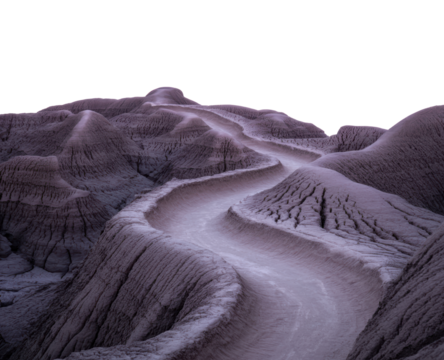 Winding dirt trail path leading through purple rocky badlands hills isolated with transparent background
