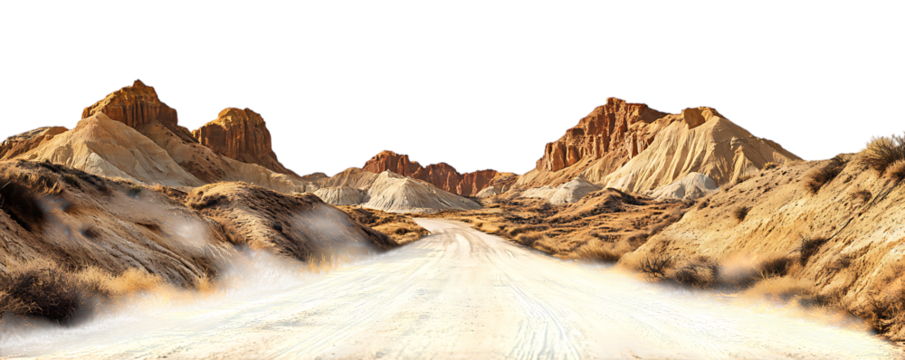 Dusty desert road winding through arid badlands with layered rock formations, high-quality PNG cutout with transparent or white background