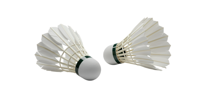 Pair of badminton shuttlecocks with white feathers and black rubber tips on transparent background