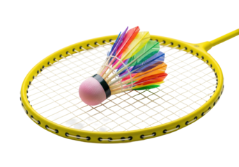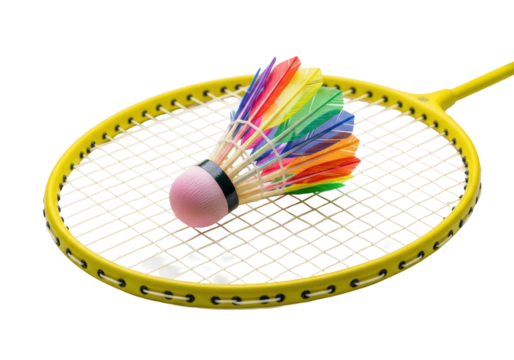 yellow composite badminton racket holding a pink-nosed, rainbow iridescent shuttlecock on taut strings. macro product shot, isolated on transparent background. concept of active sports readiness