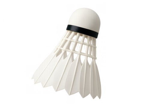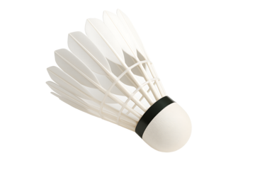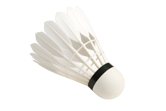 Studio shot of a badminton shuttlecock with white feathers and a rounded cork base, isolated on a transparent background