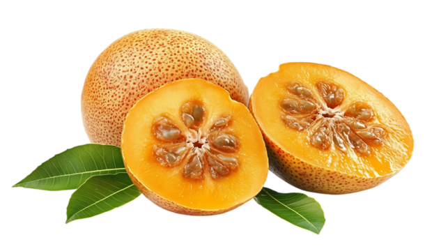 Halved Bael Fruit with Bright Orange Flesh Surrounded by Fresh Green Leaves on a Transparent Background