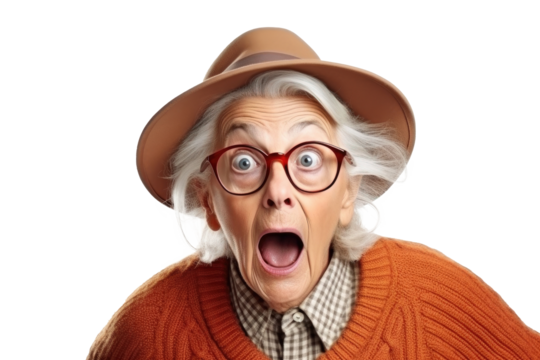 Portrait of amazed old woman with an open mouth and round big eyes wearing hat and eyeglasses on a transparent background