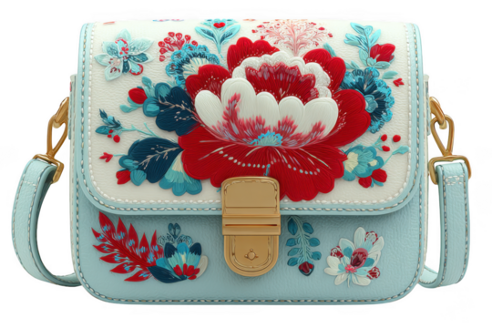 A green backpack with straps, pockets, a flower pin, and a handle, isolated on black