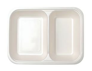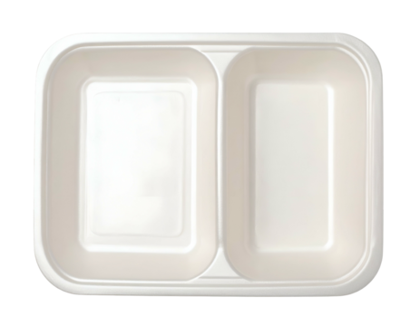A disposable, eco-friendly takeout container made from bagasse, open and empty. Isolated on transparent background