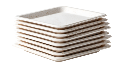 Stack of square sugarcane bagasse plates made from fibrous material, eco friendly tableware, biodegradable serving dishes for food, sustainable alternative to traditional
