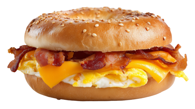 Delicious bagel breakfast sandwich with egg, sausage, and cheese isolated, a tasty and satisfying morning meal on a transparent background