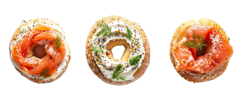Set of isolated reakfast bagel with cream cheese and smoked salmon on transparent background. cut flower elements, garden themed designs. Top view high qual