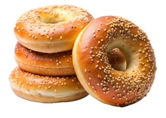 Sesame seed bagels stacked together, showcasing their fluffy texture and freshly baked perfection on a transparent background
