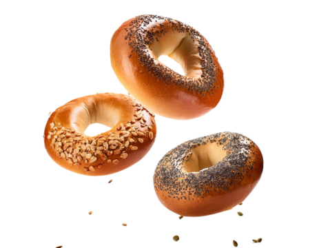 Three assorted bagels with sesame and poppy seeds, isolated on a white background.