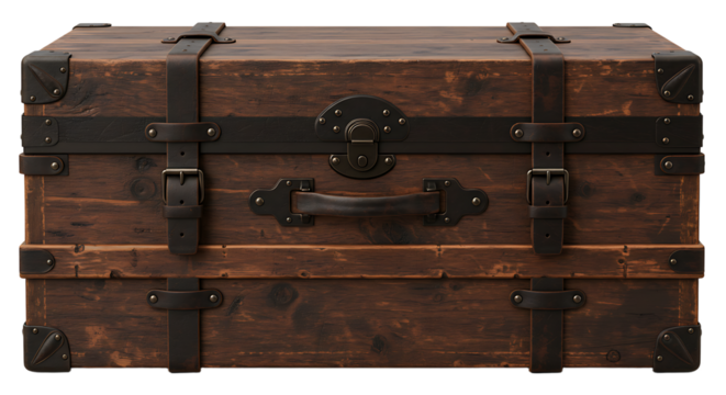 Antique wooden steamer trunk with leather straps evokes vintage travel memories