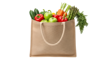 Eco-friendly cloth bag filled with fresh produce on transparent background