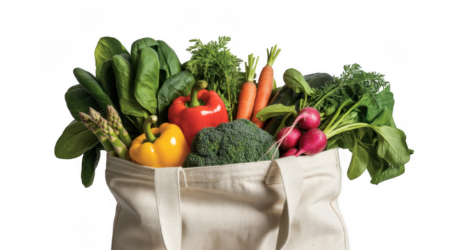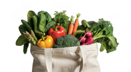 Canvas bag filled with various colorful vegetables isolated on a transparent background