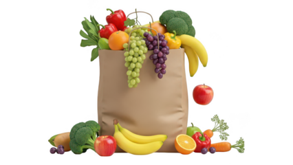 Brown paper bag filled with fresh vegetables isolated on transparent background