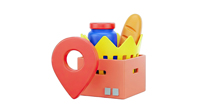 3D rendering of grocery delivery box with map pin and barcode