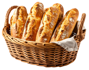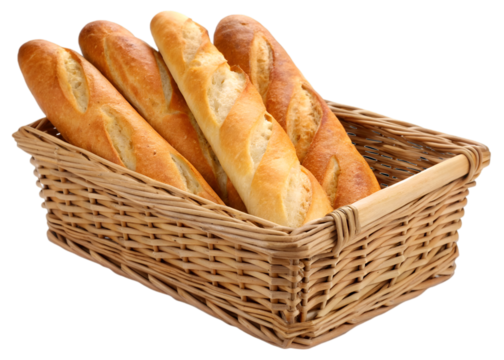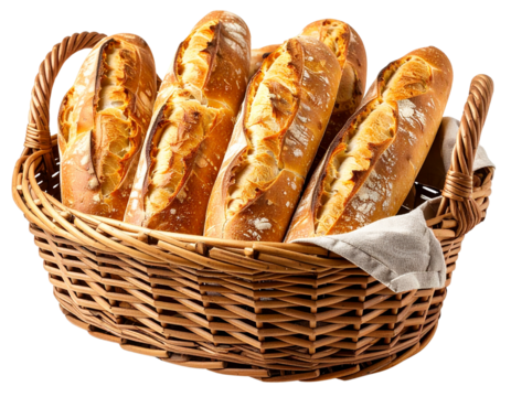 Freshly Baked Baguettes in a Wicker Basket on Transparent Background - A wicker basket filled with freshly baked baguettes, showcasing their golden crust and fluffy interior.