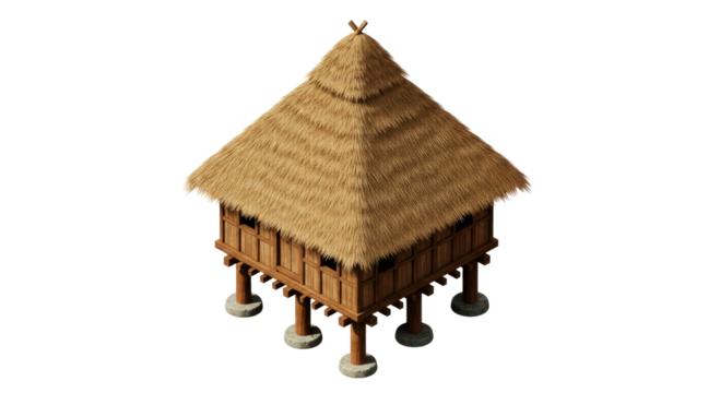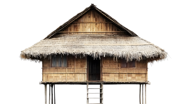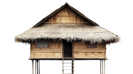 Traditional tropical stilt house, a bamboo hut with thatched roof, isolated on transparent background, indigenous architecture