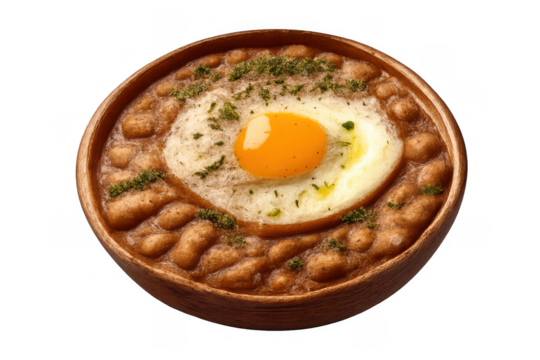 Hearty breakfast bowl featuring baked beans with a golden fried egg, sprinkled with herbs, offering a protein-rich meal
