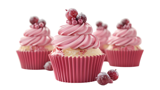 Collection of Pink cupcakes with raspberry frosting. Isolated on transparent background.