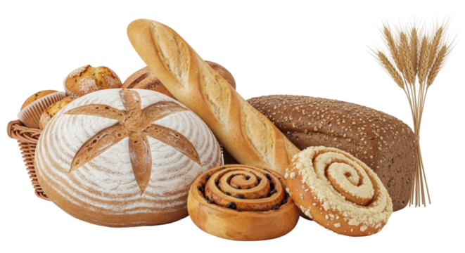 Isolated assortment of bakery items, including bread, rolls, and muffins, with wheat stalks