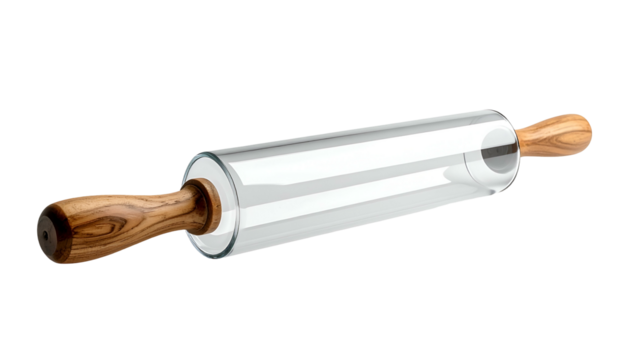 Glass rolling pin with wooden handles, kitchen utensil for baking and cooking, preparing dough, transparent background