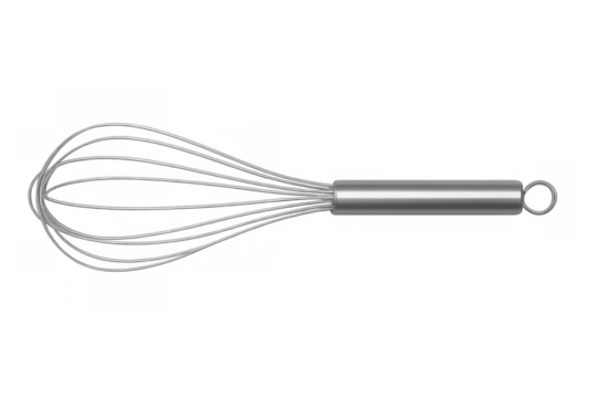 Metal whisk hanging vertically, professional bakery utensil for whisking, blending ingredients in culinary preparation