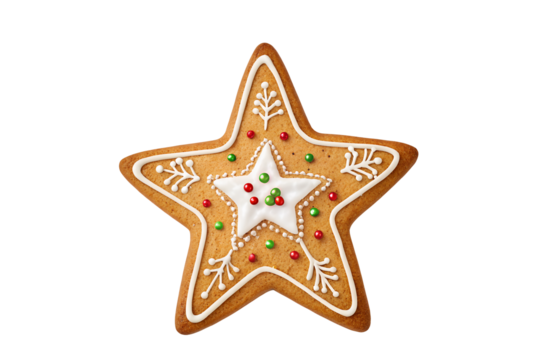Star-shaped Gingerbread Cookie with White Icing and Candy Dots on Transparent Background