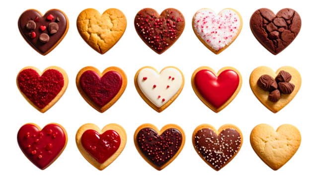 Heart-shaped cookies with sprinkles and icing, assorted love-themed biscuit designs, romantic dessert concept, isolated on transparent background
