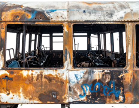 Interior view of a burnt-out train car, showcasing destruction and decay